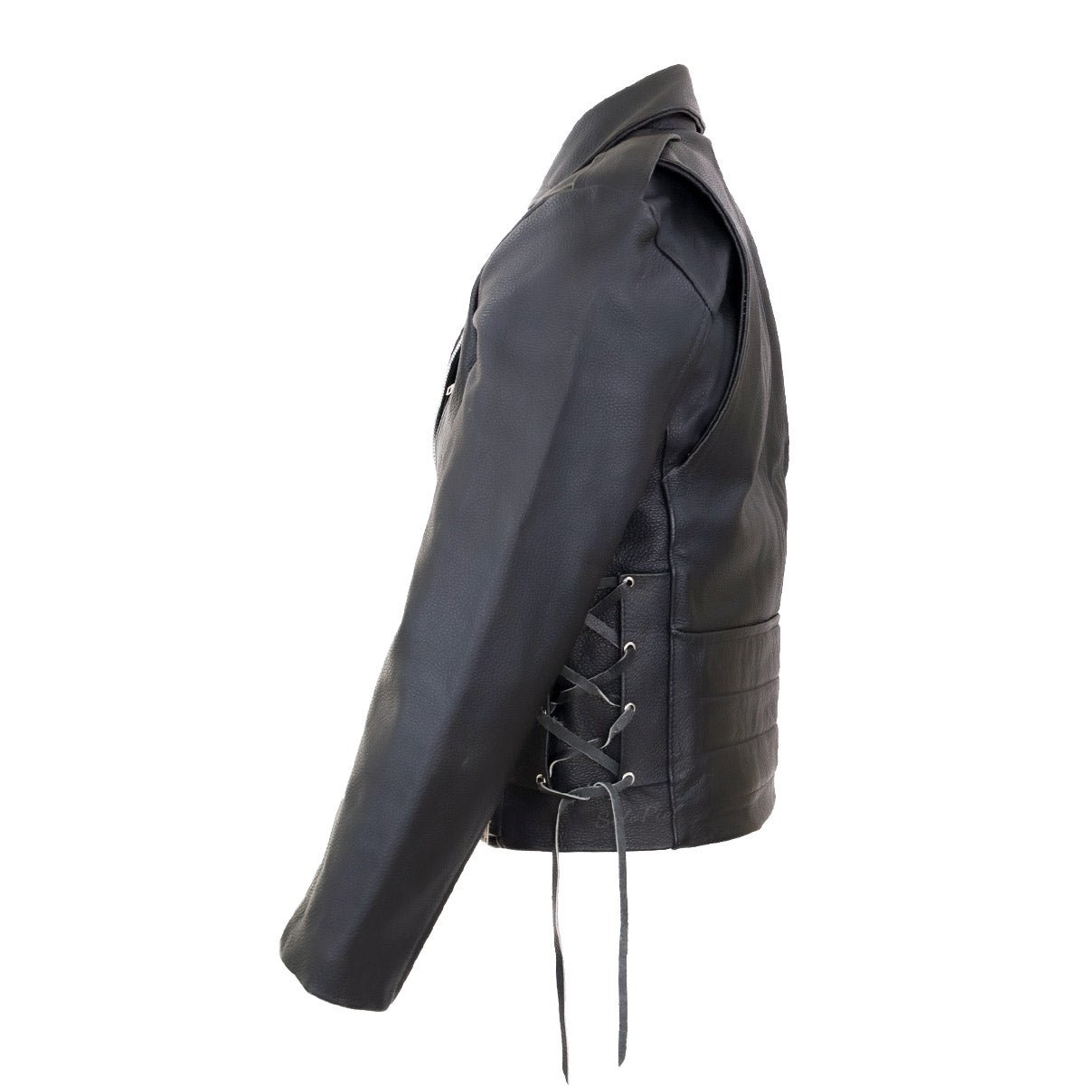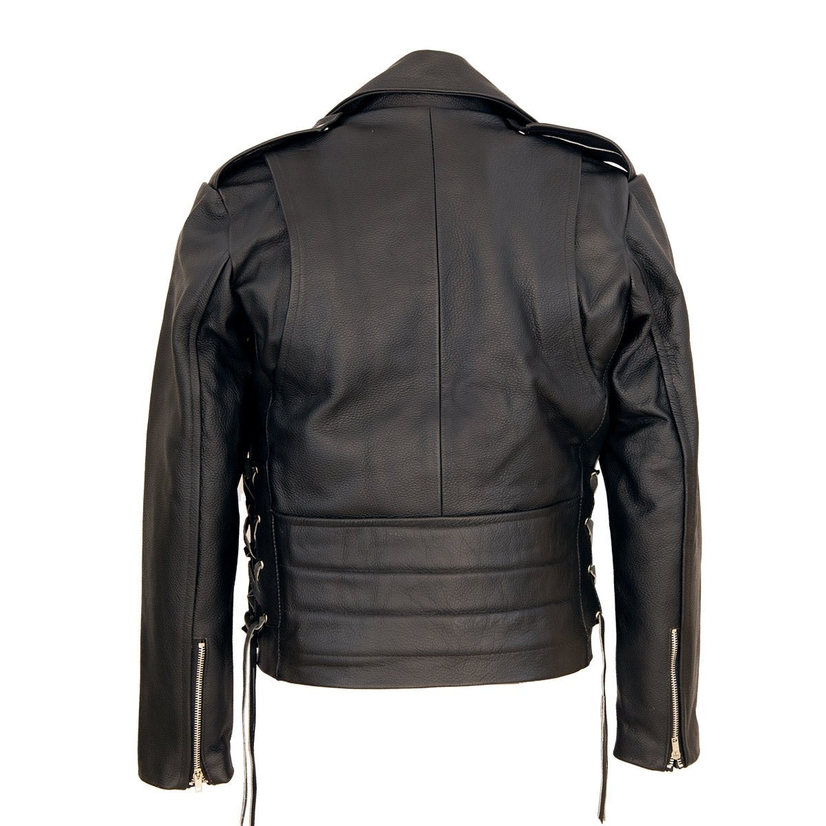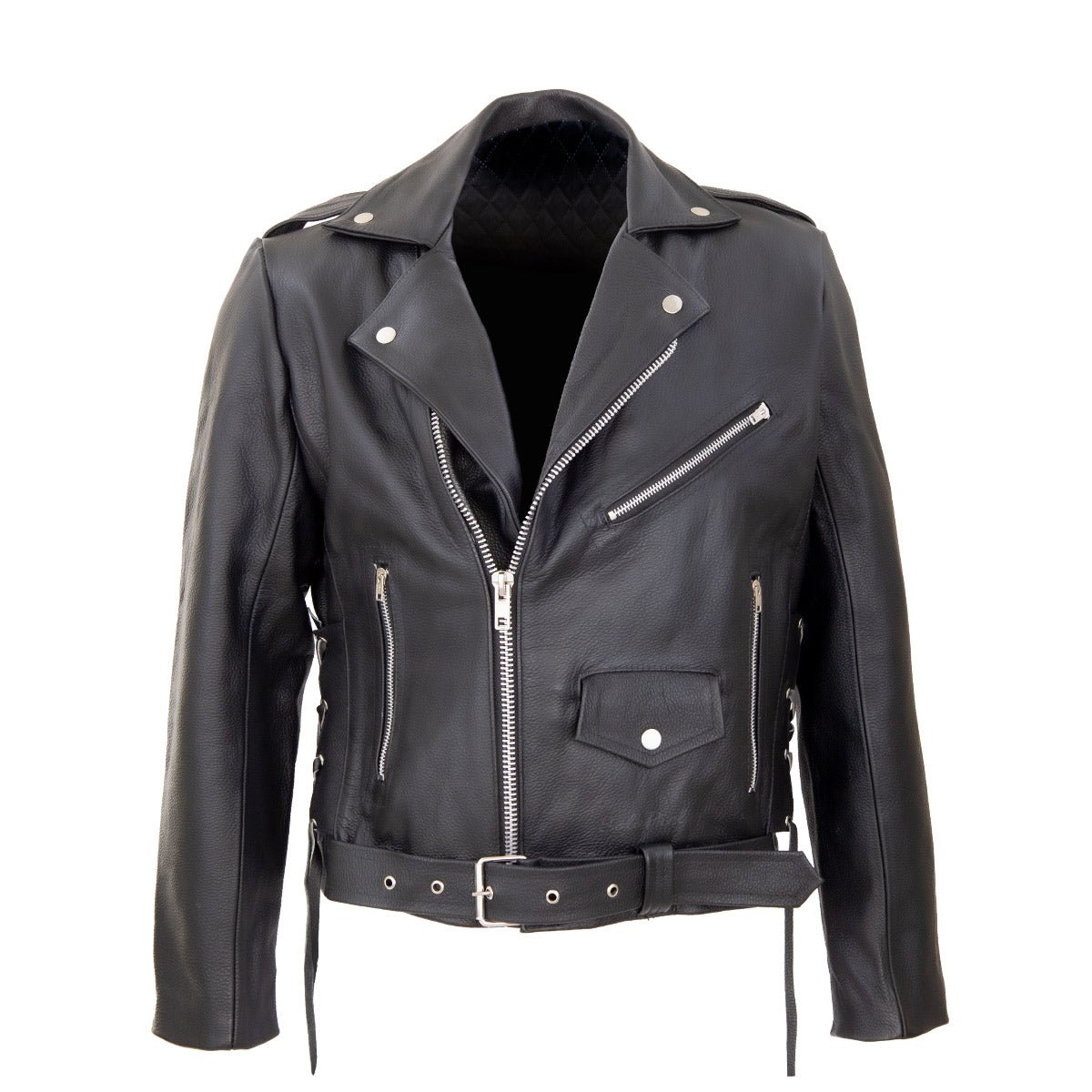 Fabricado en León Gto con piel de res entera. Tiene 3 bolsas frontales, forro de poliester capitonado, bolsa interior y cinturón de piel. Aplicaciones en acero cromado y agujetas en los costados.